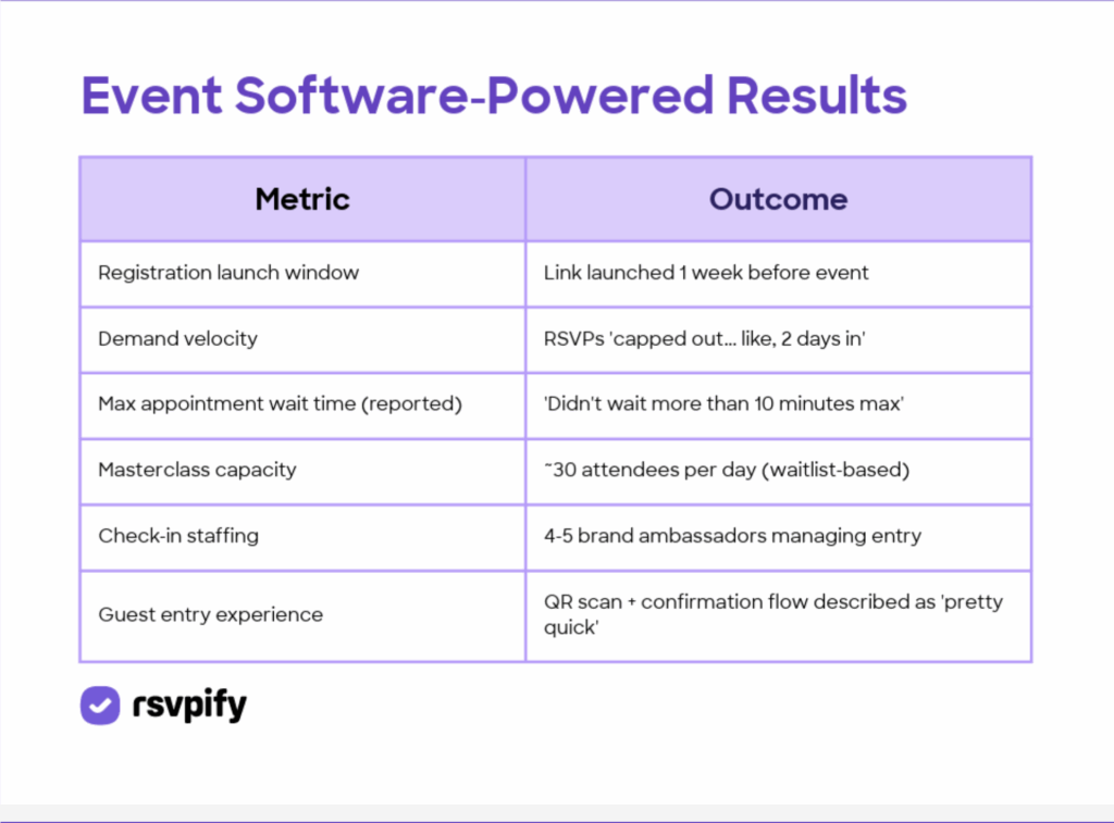 RSVPify spoke with Grisel Vazquez, a production coordinator at a boutique event agency, to understand how her team used RSVPify to manage a three day consumer pop-up featuring scheduled appointment windows, QR code-based entry, and a capped-capacity masterclass program without needing developers or custom builds.