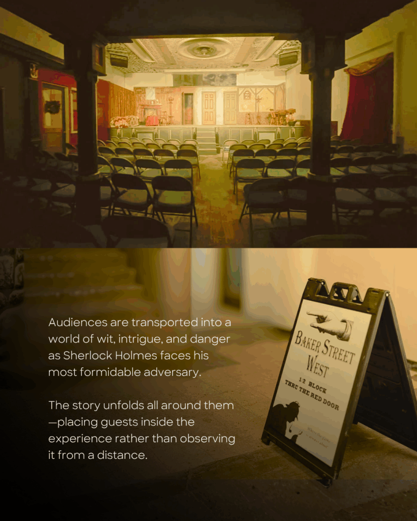 "Audiences are transported into a world of wit, intrigue, and danger as Sherlock Holmes faces his most formidable adversary in a setting where the story unfolds all around them. This marks our inaugural production of Moriarty and our first major Sherlockian production in our new courthouse venue following Baker Street West’s relocation in 2023."