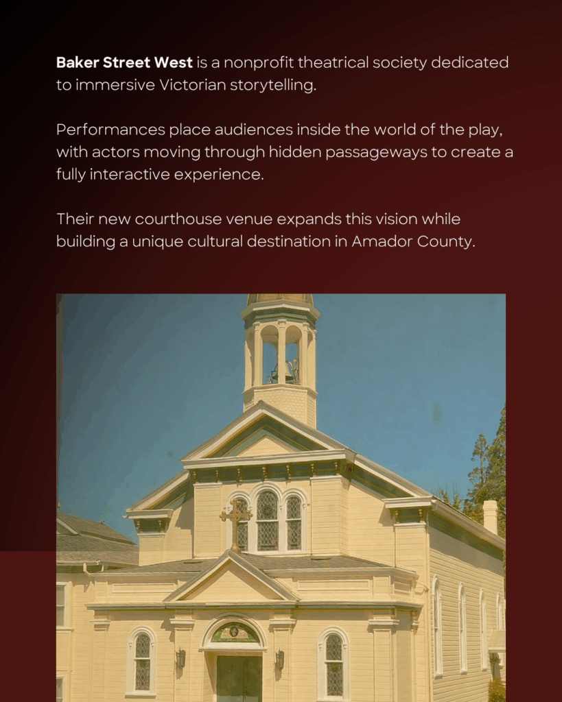 "Baker Street West is a nonprofit theatrical society dedicated to immersive Victorian storytelling. Our productions place audiences inside the world of the play, with actors moving through the space via hidden passageways, creating a uniquely interactive experience. Our new home in the historic courthouse allows us to expand this vision while continuing to build a one-of-a-kind cultural destination in Amador County."