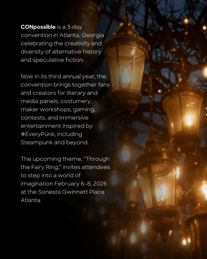 "CONpossible is an annual 3-day convention held in Atlanta, GA that celebrates the creativity and diversity of alternative history and speculative fiction. Our programming includes costumery, maker panels and workshops, and a variety of entertainment focused on #EveryPunk (Steampunk etc). This is our 3rd annual event."