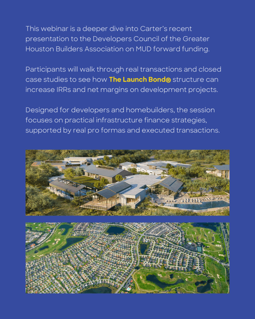 "This webinar is a deeper dive into Carter’s recent presentation to the Developers Council of the Greater Houston Builders Association on MUD forward funding. He will walk through real transactions to show how The Launch Bond® can increase IRRs and net margins on development projects. This specific webinar is a follow-up to a live presentation given earlier this month to GHBA. Launch regularly hosts various webinar discussions for developers and homebuilders on infrastructure finance strategies."