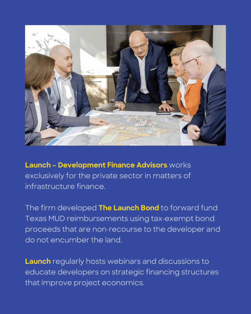 "Launch works exclusively for the private sector in matters of infrastructure finance. We developed The Launch Bond® as a way to forward fund Texas MUD reimbursements using tax-exempt bond proceeds, non-recourse to the developer and without encumbering the land.In this webinar, we show actual pro formas and case studies — including transactions that have already closed — to demonstrate how the structure works in practice."
