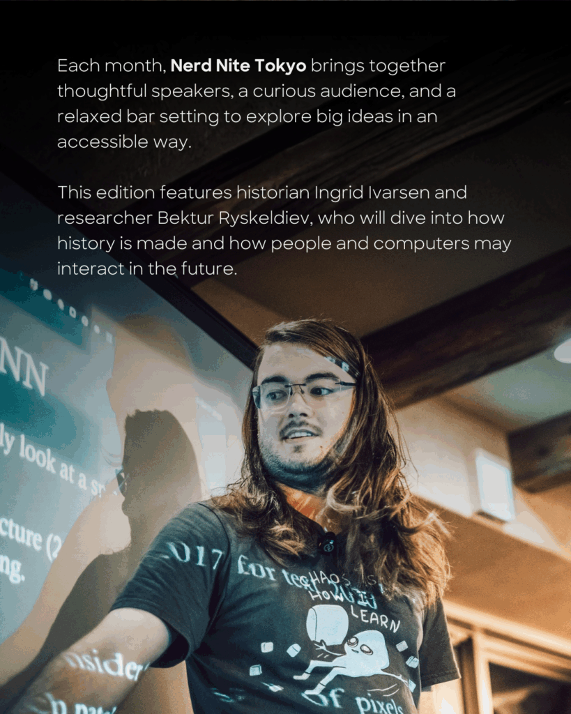 "Nerd Nite is part of a global community of speaking events (see nerdnite.com). The Tokyo edition helps raise money for the non-profit Yokohama Theatre Group"