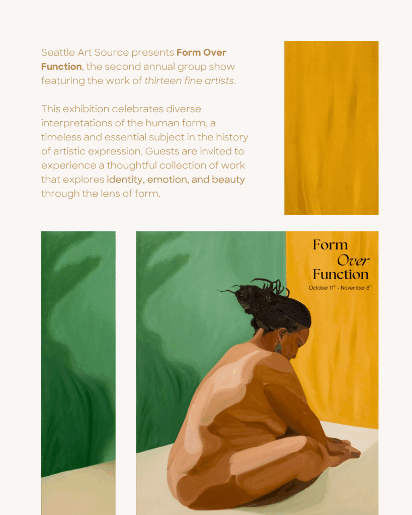 “Seattle Art Source is proud to present the work from thirteen fine artists in a gathering entitled “Form Over Function”. This second annual group show celebrates various perspectives on capturing the human form, a long celebrated tradition in the history of human achievement. This is the second annual group show.