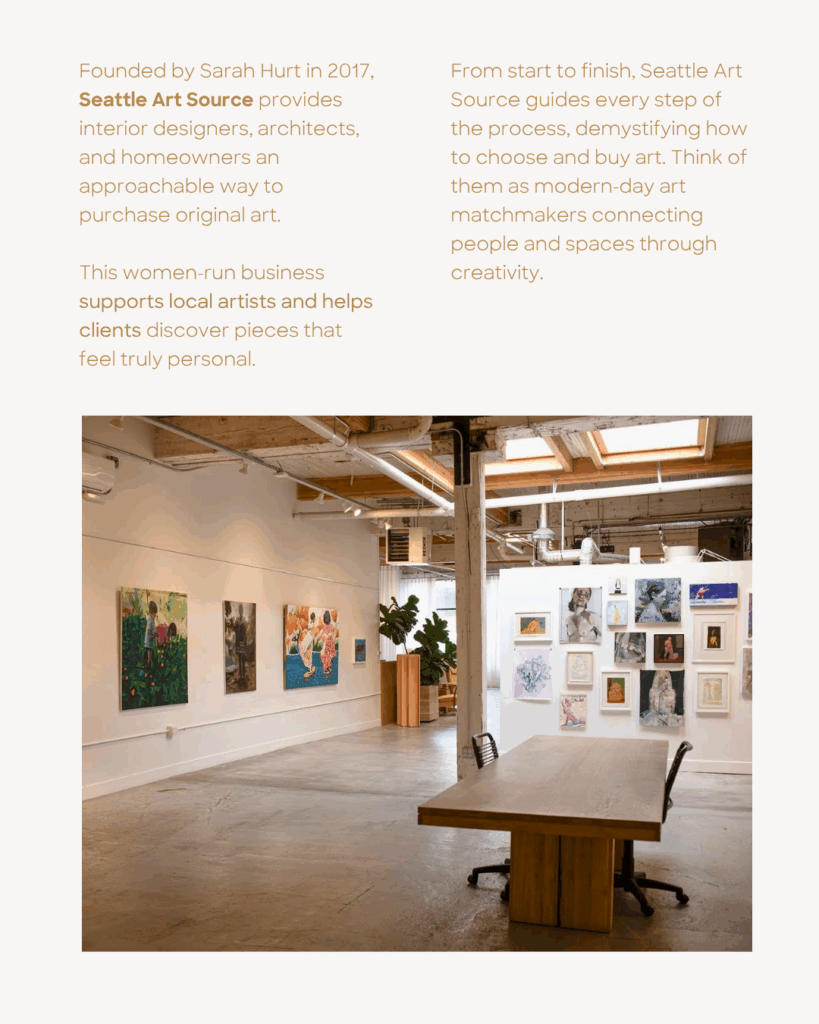“Seattle Art Source was founded by Sarah Hurt in 2017 to provide interior designers, architects and homeowners an approachable way to purchase original art. This entirely women-run business supports local artists and consistently finds right piece for every project and budget. From start to finish, they’ll be your guide and demystify the process of choosing and buying art. Think of them as your modern-day art matchmakers.