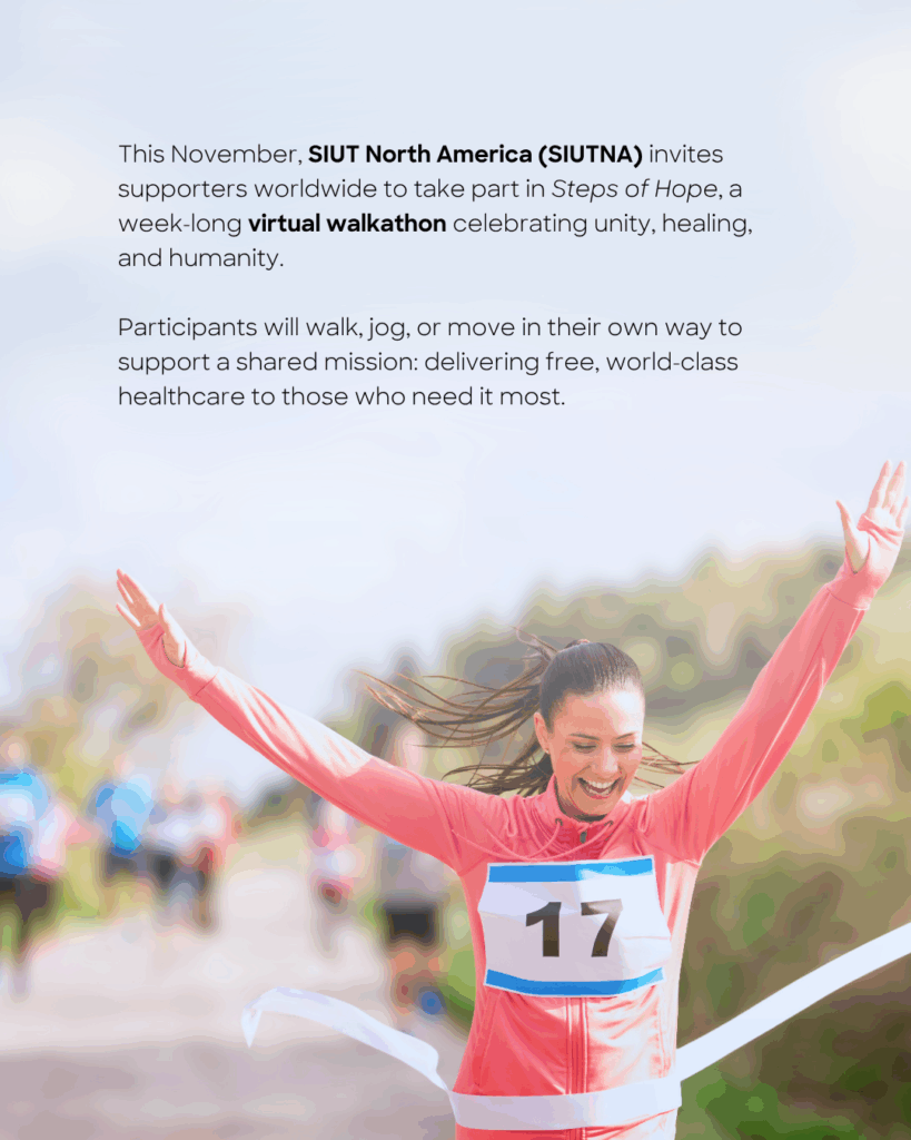 "Join SIUT North America (SIUTNA) for our Steps of Hope Virtual Walkathon, a week-long celebration of unity, healing, and humanity, all in support of free, world-class healthcare for all."