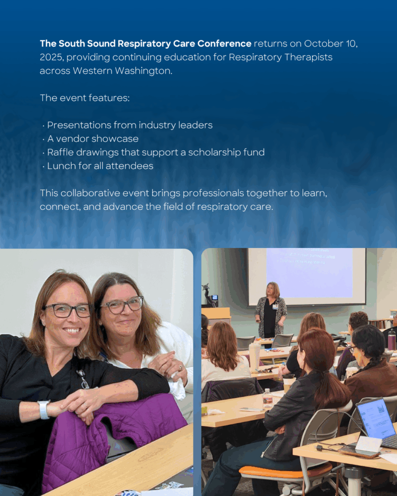 “The South Sound Respiratory Care Conference is a medical conference for continuing education of Respiratory Therapists in the Western Washington State region. It includes industry leader speakers, vendor area, raffle drawings to contribute to a scholarship fund, and a lunch included. After taking a hiatus during the pandemic, we have provided this event since 2022.”
