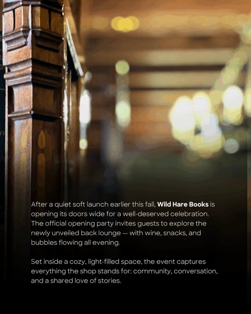 "After a quiet opening in September of this year, Wild Hare Books is ready to celebrate with an official opening party and invitation to see our new back lounge. We'll have wine, snacks, and bubbles...super sized!"