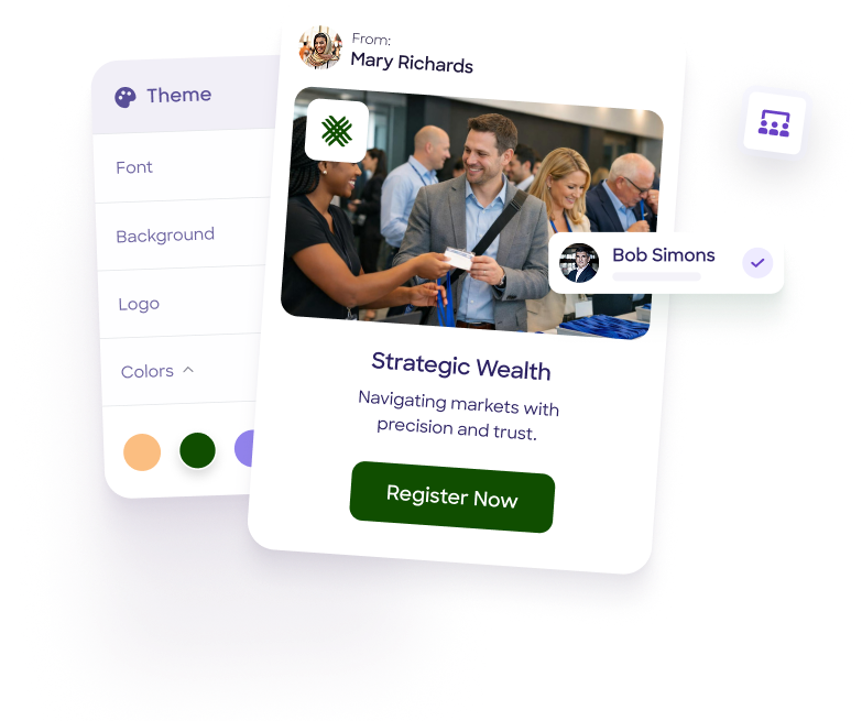 Keep the focus on your financial institution with complete branding customization. Send fully branded emails from your own domain and create custom event websites that reflect your professional image.