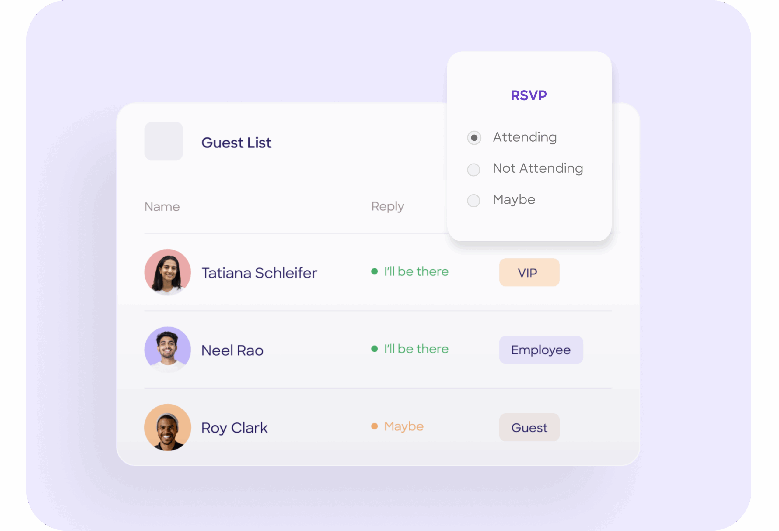 No account is required. Guests simply open your event link and respond in seconds. Their RSVP syncs instantly to your dashboard, where you can view all responses and manage details.