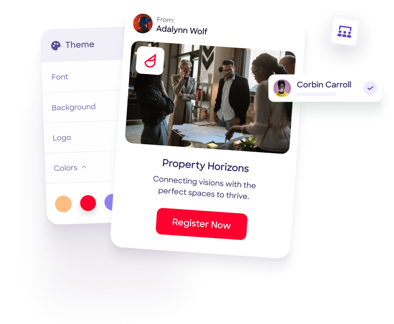 Create professional, custom event websites that showcase your properties and brand identity with your logo, colors, and messaging. Share key event details, property highlights, and registration forms on a single, elegant page that reflects your real estate brand.
