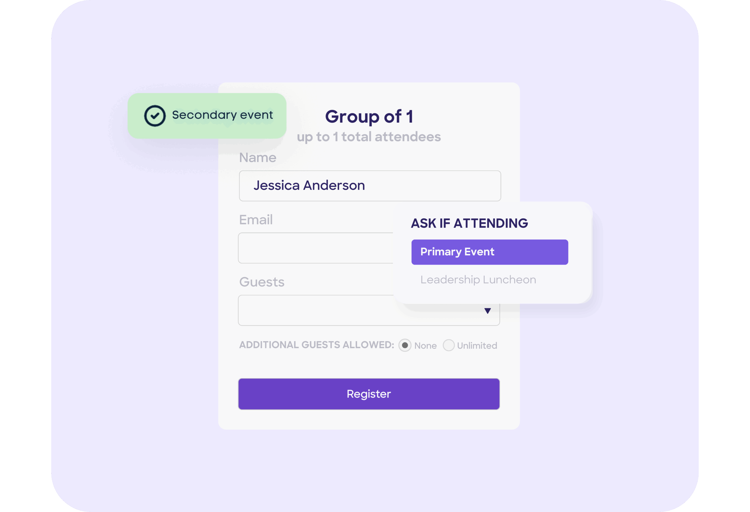 No. Guest details automatically carry over from the main event. Attendees simply select whether they’ll attend the secondary event, keeping the experience fast and frictionless.
